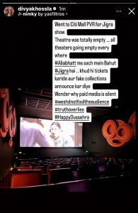 Sharing a photo of an empty theatre, Divya wrote, “Went to Citi Mall PVR for Jigra show. Theatre was totally empty … all theaters going empty every where. #Aliabhatt me sach mein Bahut #Jigra hai.. khud hi tickets karide aur fake collections announce kar diye. Wonder why paid media is silent. #weshdnotfooltheaudience #truthoverlies #HappyDussehra Х (sic).”