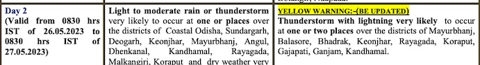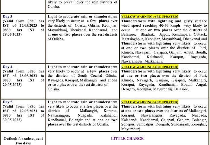 Yellow warning for thunderstorm with lightning has also been issued for some places in Bhadrak, Jajpur, Kendrapada, Cuttack, Jagatsinghpur, Puri, Dhenkanal, Kandhamal, Kalahandi, Nabarangpur, Balangir and Nuapada. There is also a forecast for light to moderate rain at a few places in South Interior Odisha, Gajapati, Ganjam, Mayurbhanj, Balasore, Bhadrak, Puri, Khurda and at
