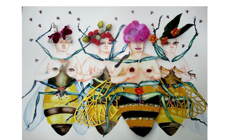 Four paintings of Daina on display have mixed media on paper.