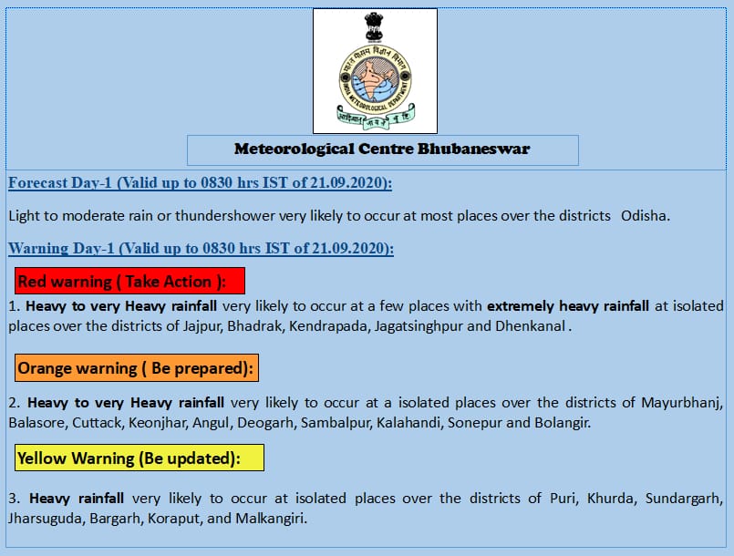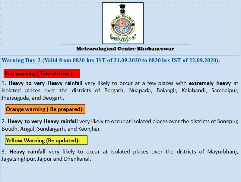 Yellow Warning: Heavy rainfall very likely to occur at isolated places in Jharsuguda, Keonjhar and Sundargarh.
