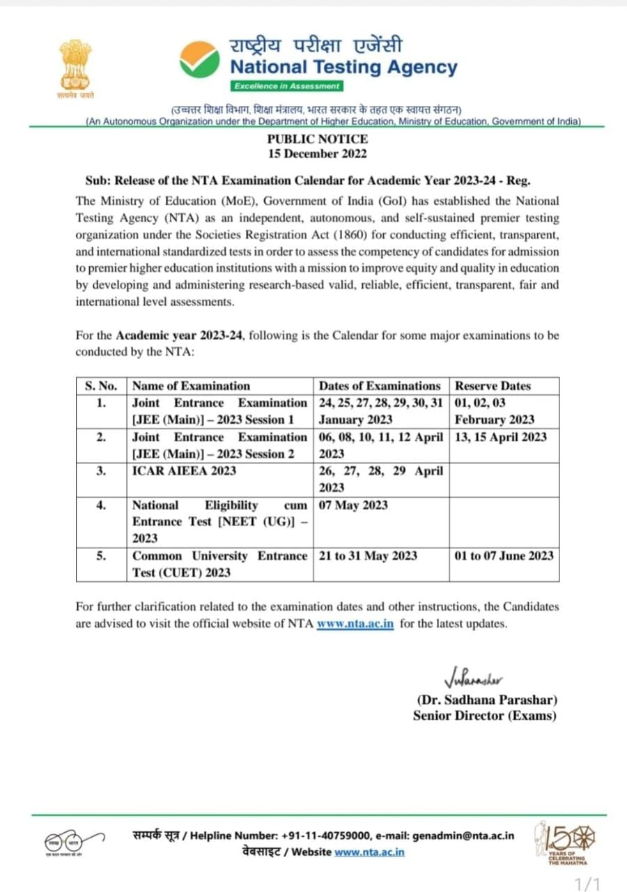 Bhubaneswar: The National Testing Agency (NTA) on Thursday released the annual exam calendar for major entrance exams in 2023.
