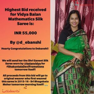 Thanking all participants of the e-auction, Utkalamrita wrote in its social media post, “Finally, we have our winner. With the winning bid of Rs 55,000, 20-year-old talented Odia girl Debanshi has placed her stamp firmly on the same piece of Shri Ganeet Sambalpuri Bandha silk saree, worn by Bollywood Diva Vidya Balan earlier on July 30 for promotion of Shakuntala Devi.”