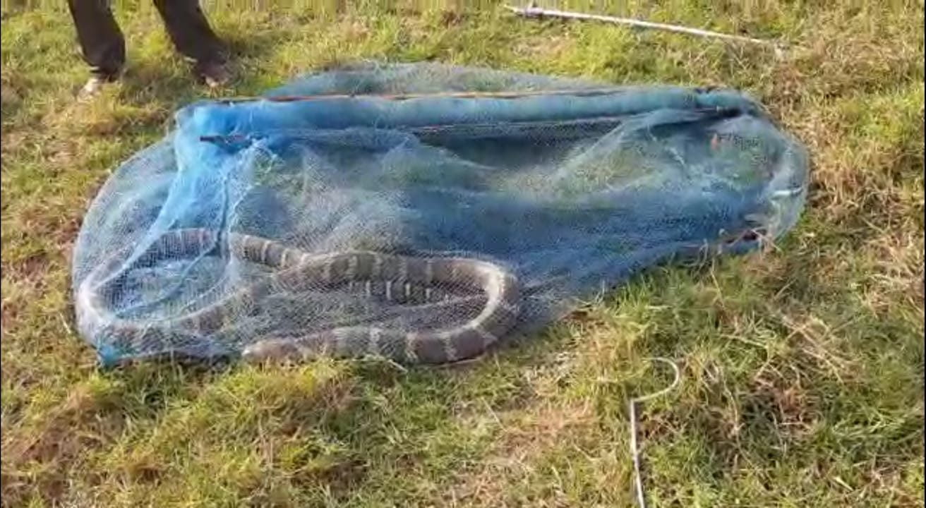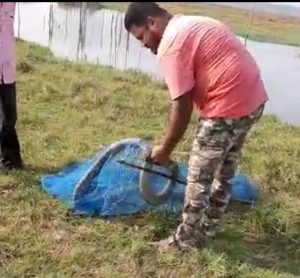 Mishra reached the spot and went to the spot in a boat. The snake was brought in the fish net to the banks and rescued from the net.