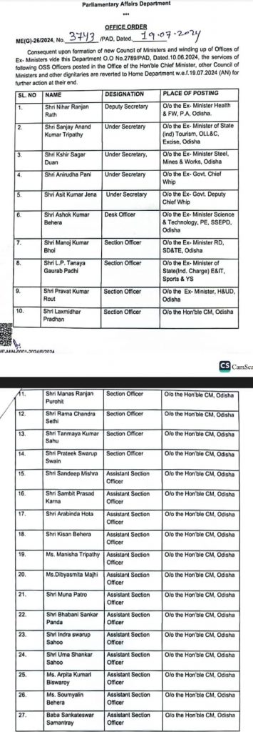 “Consequent upon formation of new Council of Ministersand winding up of Offices of Ex-Ministers vide this Department O.Ono. 2789/PAD, dated 10.06.2024, the services of following OSS Officers posted in the Office of the Hon’able Chief Minister, other Council of Ministers and other dignitaries are reverted to Home Department,” the notification read.