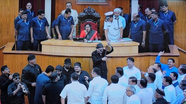 As soon as the House assembled for the Question Hour, the agitating Congress MLAs trooped into the Well and attempted to climb the speaker’s podium.