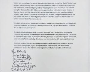 The BJD delegation stated in its representation to the State Election Commissioner that the BJP workers killed BJD supporter Pratap Chandra Rout in Dhamnagar (Bhadrak) on Monday.