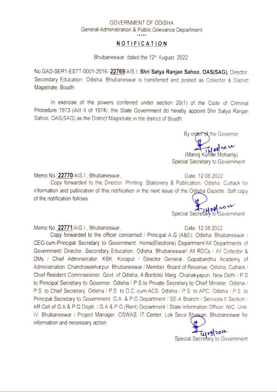 Bhubaneswar: Odisha Administrative Officer (OAS) Satya Ranjan Sahoo was on Friday appointed collector of Boudh district, replacing Babitarani Dalabehera. Sahoo is currently serving as Director, Secondary Education.