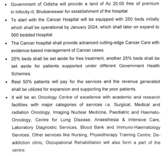 Bhubaneswar: The Odisha cabinet on Monday approved the establishment of Bagchi-Sri Shankara Cancer Hospital and Research Institute and Bagchi-Karunashraya Palliative Care Centre in Bhubaneswar.