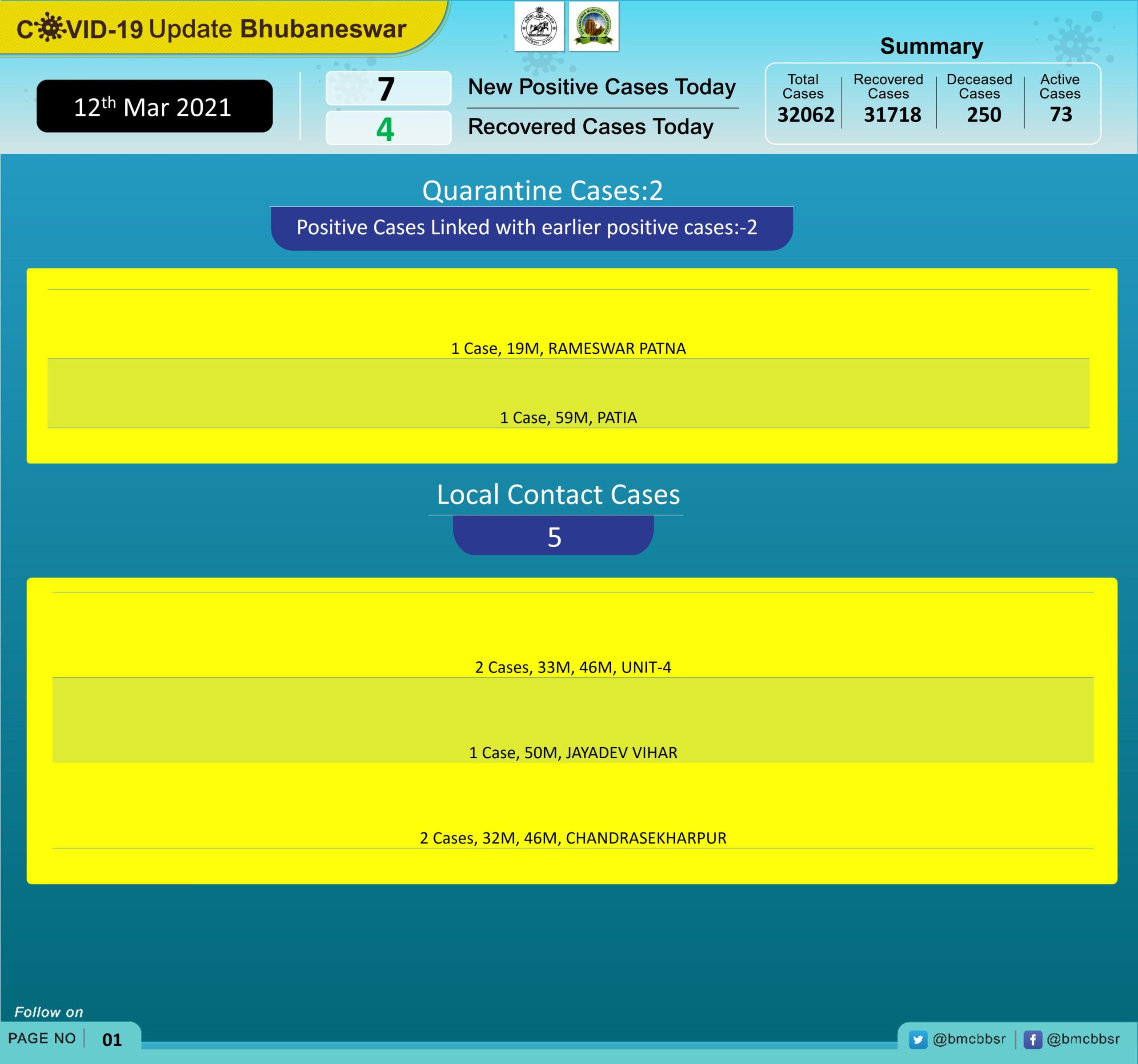 Bhubaneswar: Seven more people have tested positive for COVID-19 in the Capital city in the last 24 hours, Bhubaneswar Municipal Corporation (BMC) informed on Friday.