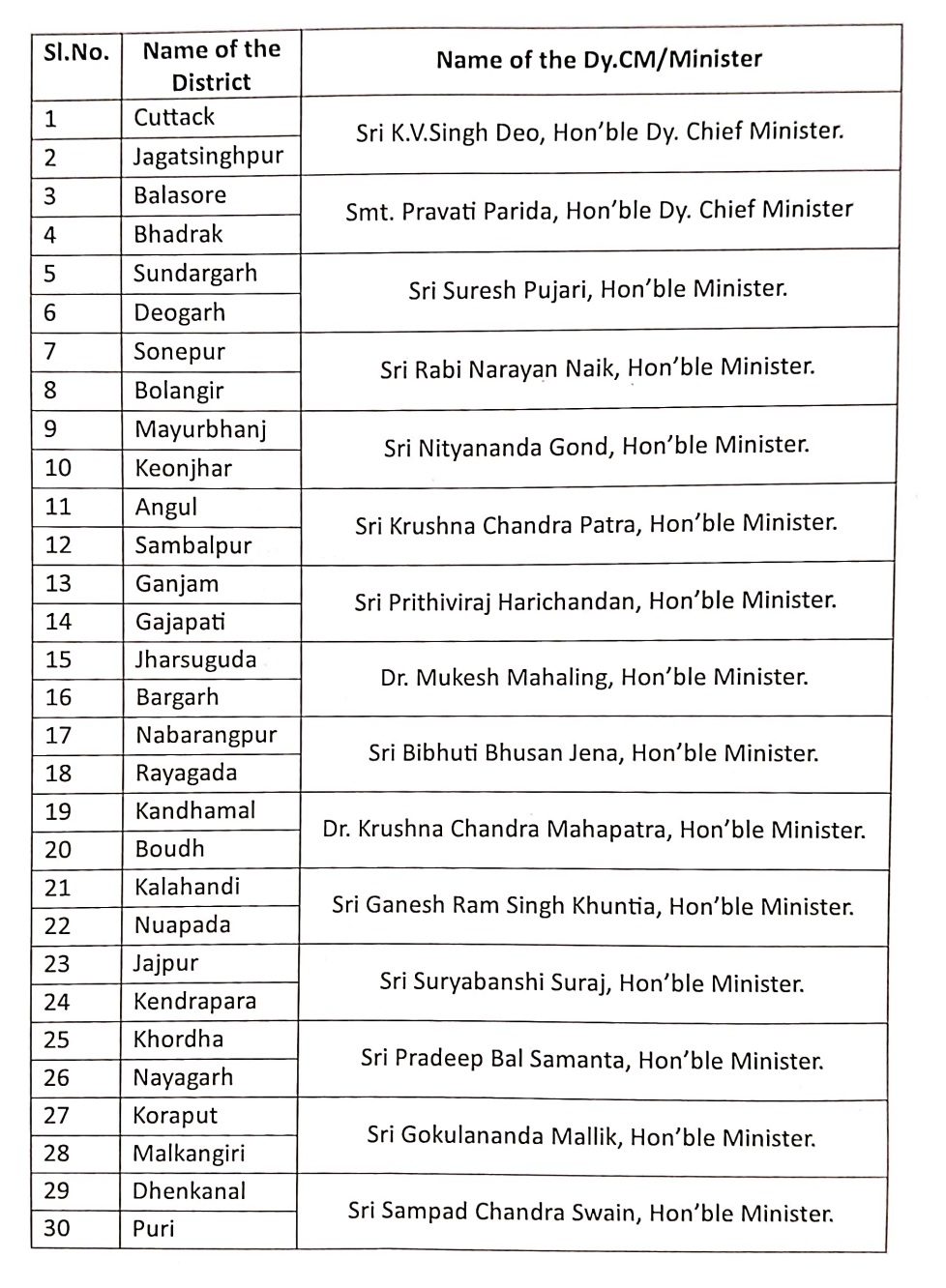 A release from the chief minister’s office said the deputy chief ministers and the ministers are designated as Prabhari Mantri in all 30 districts of the state.