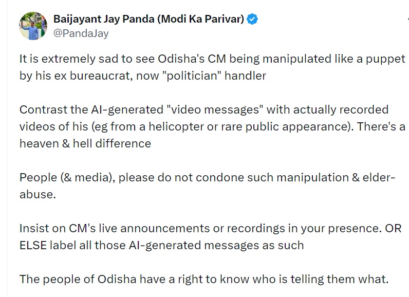Baijayant, who is also BJP’s Lok Sabha candidate for Kendrapada seat, termed it as abuse of elderly person and appealed to the media not to condone it. “People (& media), please do not condone such manipulation & elder-abuse. Insist on CM’s live announcements or recordings in your presence or else label all those AI-generated messages as such,” he said.