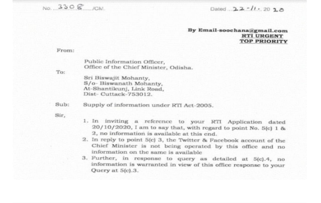 In its reply to Mohanty through e-mail on November 22, the Public Information Officer, Office of the Chief Minister, Odisha said, “The Twitter & Facebook account of the Chief Minister is not being operated by this office and no information on the same is available.”