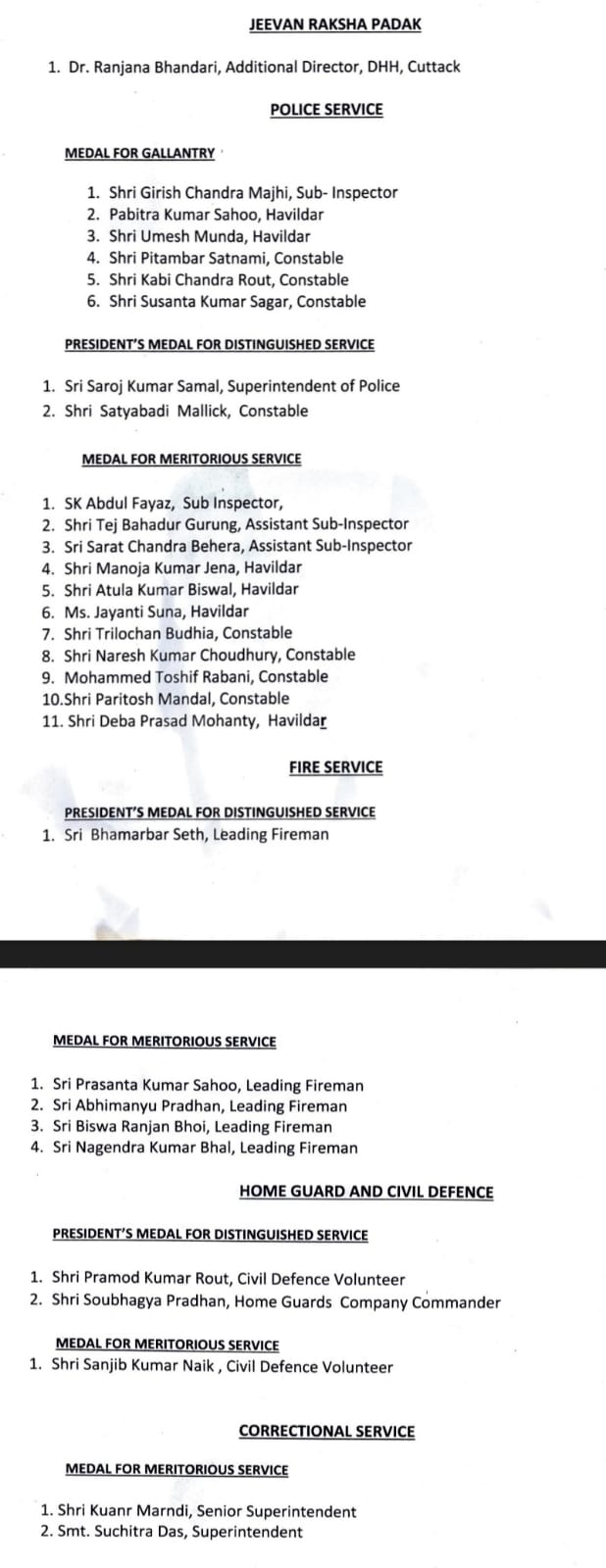 Bhubaneswar: Police personnel from Odisha selected for different awards received the prestigious medals in various categories on the occasion of Independence Day on Friday.