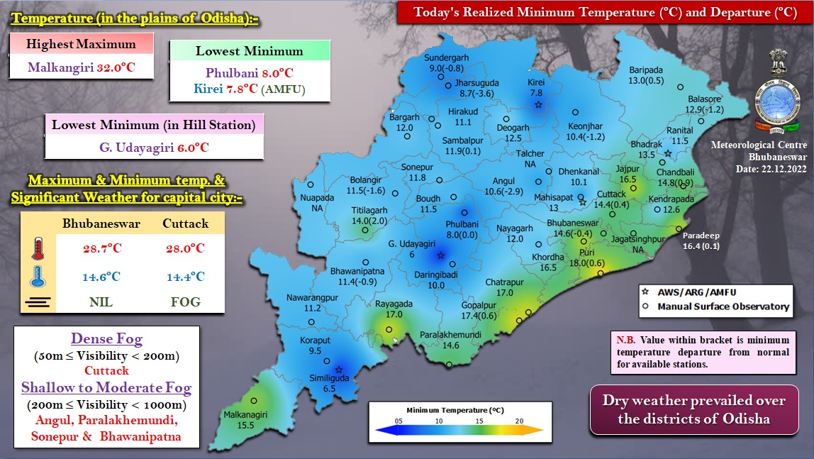 Similiguda in Koraput recorded 6.5°C followed by Kirei (Sundargarh) at 7.8°C and Phulbani (Koraput) at 8°C each.