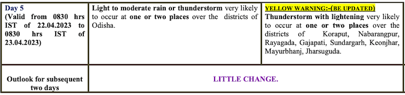While the heatwave will abate thereafter, yellow alert for thunderstorm and lightning has been issued for several districts for the next 3 days. Some places in South Odisha will also experience rain till 8.30 am on April 20. Light to moderate rain or thunderstorm is likely across all districts in the state in the subsequent 24 hours, the IMD said in its midday bulletin.