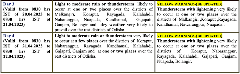 While the heatwave will abate thereafter, yellow alert for thunderstorm and lightning has been issued for several districts for the next 3 days. Some places in South Odisha will also experience rain till 8.30 am on April 20. Light to moderate rain or thunderstorm is likely across all districts in the state in the subsequent 24 hours, the IMD said in its midday bulletin.
