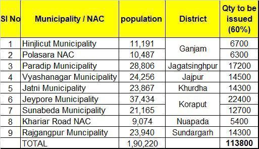 Bhubaneswar: The Odisha Government on Friday supplied 1,13,800 doses of state-procured Covishield to 9 Municipalities/NACs for vaccination of people in the age group of 18 to 44.