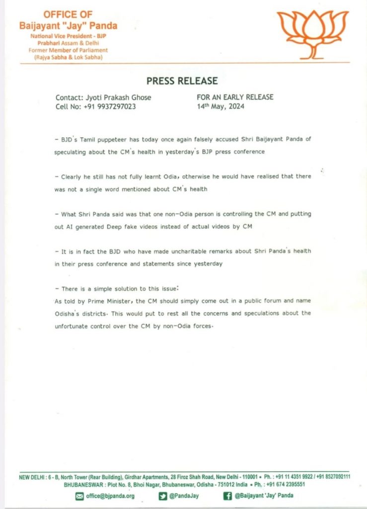 In a press release on Tuesday, Panda said the BJD’s Tamil puppeteer has falsely accused him of speculating about the chief minister’s health. “Clearly he still has not fully learnt Odia, otherwise he would have realised that there was not a single word mentioned about CM’s health in yesterday’s BJP press conference,” he said.