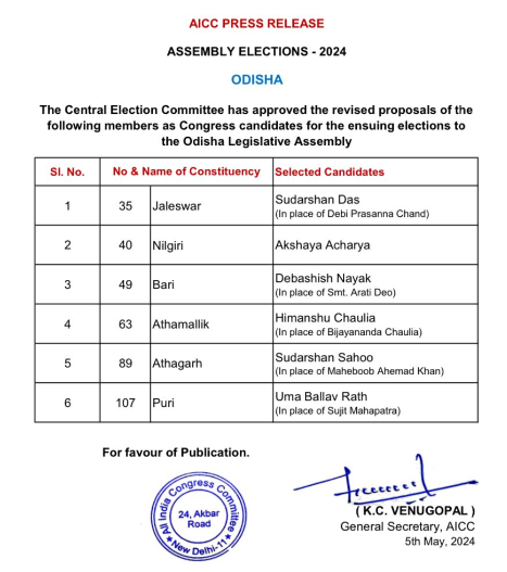This apart, the grand old party changed its candidates for Jalwswar, Bari, Athamallik, Athagarh and Puri Assembly seats.