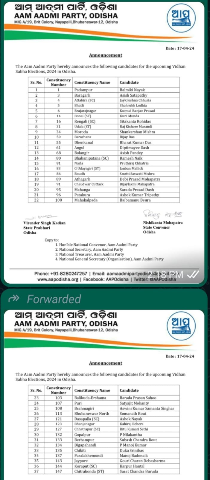 Bhubaneswar: CPI (M) and Aam Aadmi Party (AAP) have announced their candidates for Odisha for the upcoming Lok Sabha and Assembly elections.