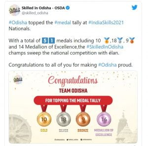 Chief Minister Naveen Patnaik has congratulated the ‘Skilled in Odisha’ youths for their performance in the competition. “Proud of SkilledOdisha youths as Odisha became No.1 in Gold, No.1 in Silver, No.1 in Bronze & No. 1 in Medallion tally at  IndiaSkills2021 which is possible by shared vision & collective hard work,” he said in a tweet.