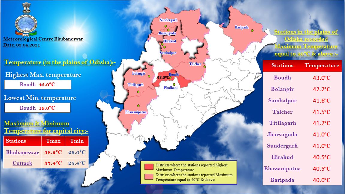 The mercury also dropped at some places on Friday. Bhubaneswar, which had earned the hottest places in the country tag two days back, recorded 38.2 degree Celsius. However, 10 places in the state saw the temperature hovering between 40 and 43 degree Celsius. Boudh was the hottest at 43 degree Celsius followed by Balangir (42.2) and Sambalpur (41.6).