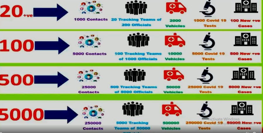 Displaying a probability chart to highlight the magnitude of the contact tracing exercise, he said if 20 samples are tested positive tonight and taking the average number of 50 persons coming in contact with each person, then the government has to contact 1000 people in the night on the same day.