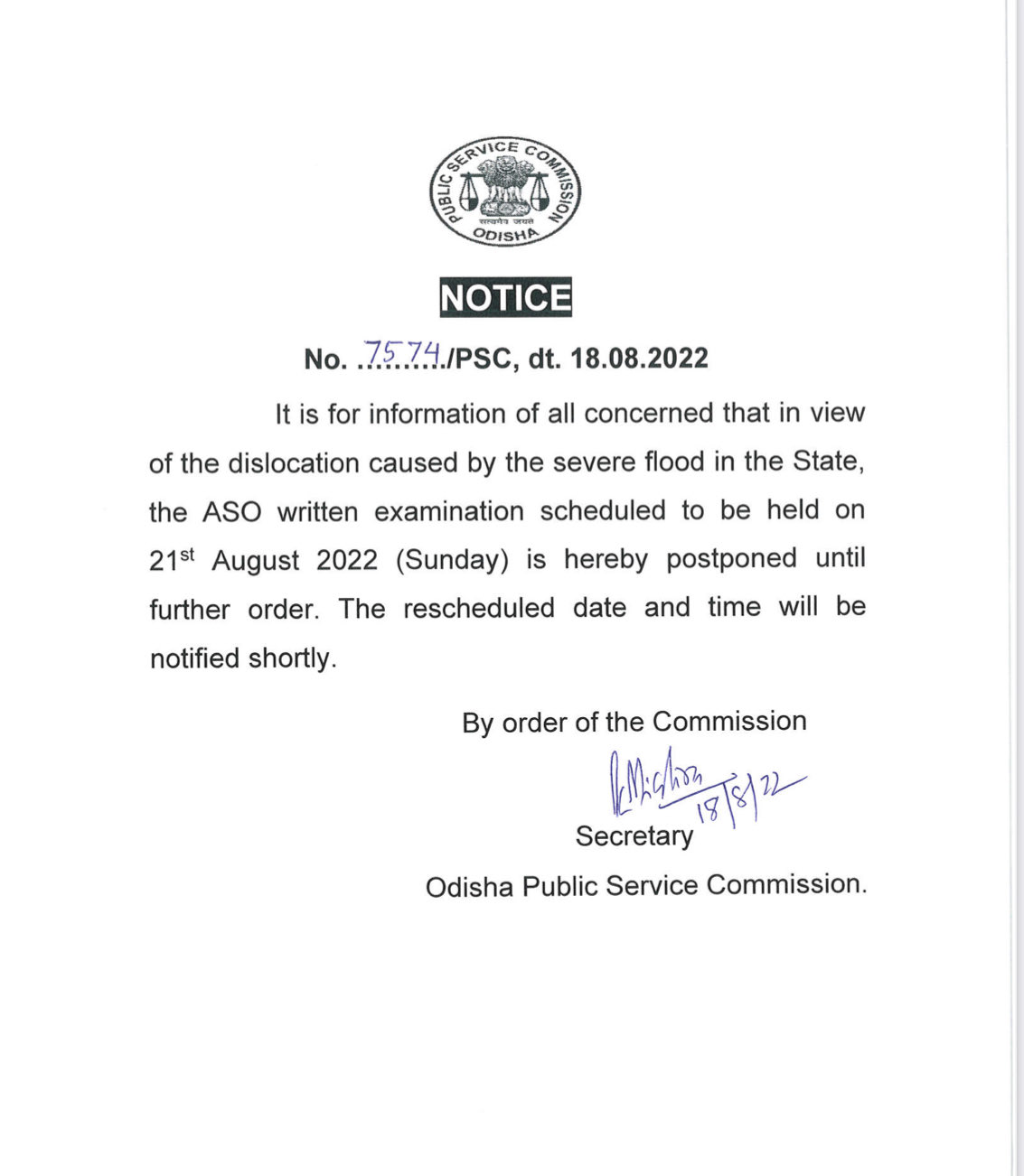 Bhubaneswar: The Odisha Public Service Commission has postponed the Assistant Section Officer (ASO) written exam scheduled to be held on August 21, in view of the dislocation caused by the severe flood in the state.