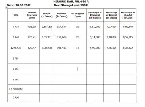The water level in the dam was 620.47 ft at 12 noon on Saturday. The inflow of water at the reservoir was 1,90,298 cusecs while the outflow was 2,91,433 cusecs at 12 noon on Saturday.