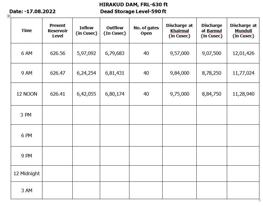 The outflow of water from Hirakud Dam, where 40 gates have been opened to discharge floodwaters, is 6.79 lakh cusec against the inflow of 6.24 lakh cusecs. The peak discharge at Mundali started falling from 12,01,426 at 6 am to 11,77,024 cusecs at 9 am and again to 11,28,940 at 12 noon. Khairmal saw a peak discharge of 9.84 lakh cusec at 9 am against 9.57 lakh at 6 am. It fell to 9.75 lakh cusec by 12 noon.