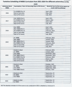 He said the schedule for the MBBS curriculum from 2021 to 2024 may be adhered to by the aforesaid universities for notification. In case any notification has been issued earlier to this effect, the same may be revised as per the schedule mentioned hereunder: