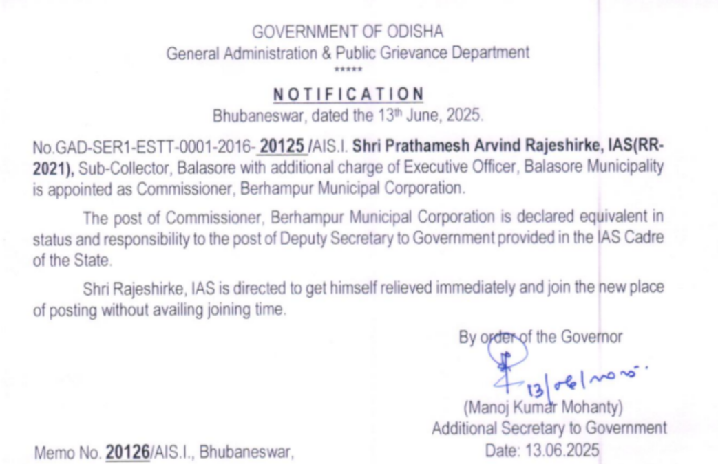 Bhubaneswar: The Odisha government on Friday appointed Prathamesh Arvind Rajeshirke as the new commissioner of Berhampur Municipal Corporation (BeMC).