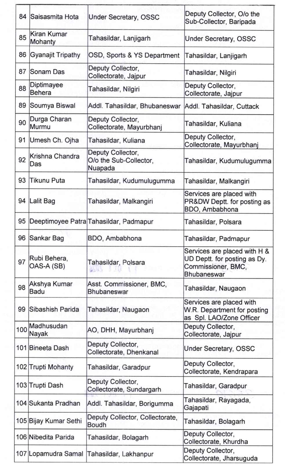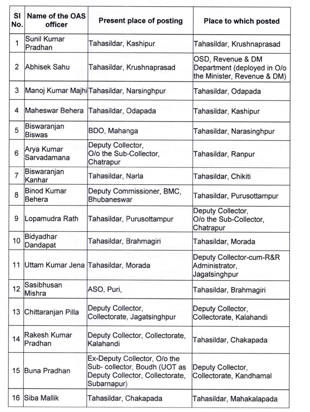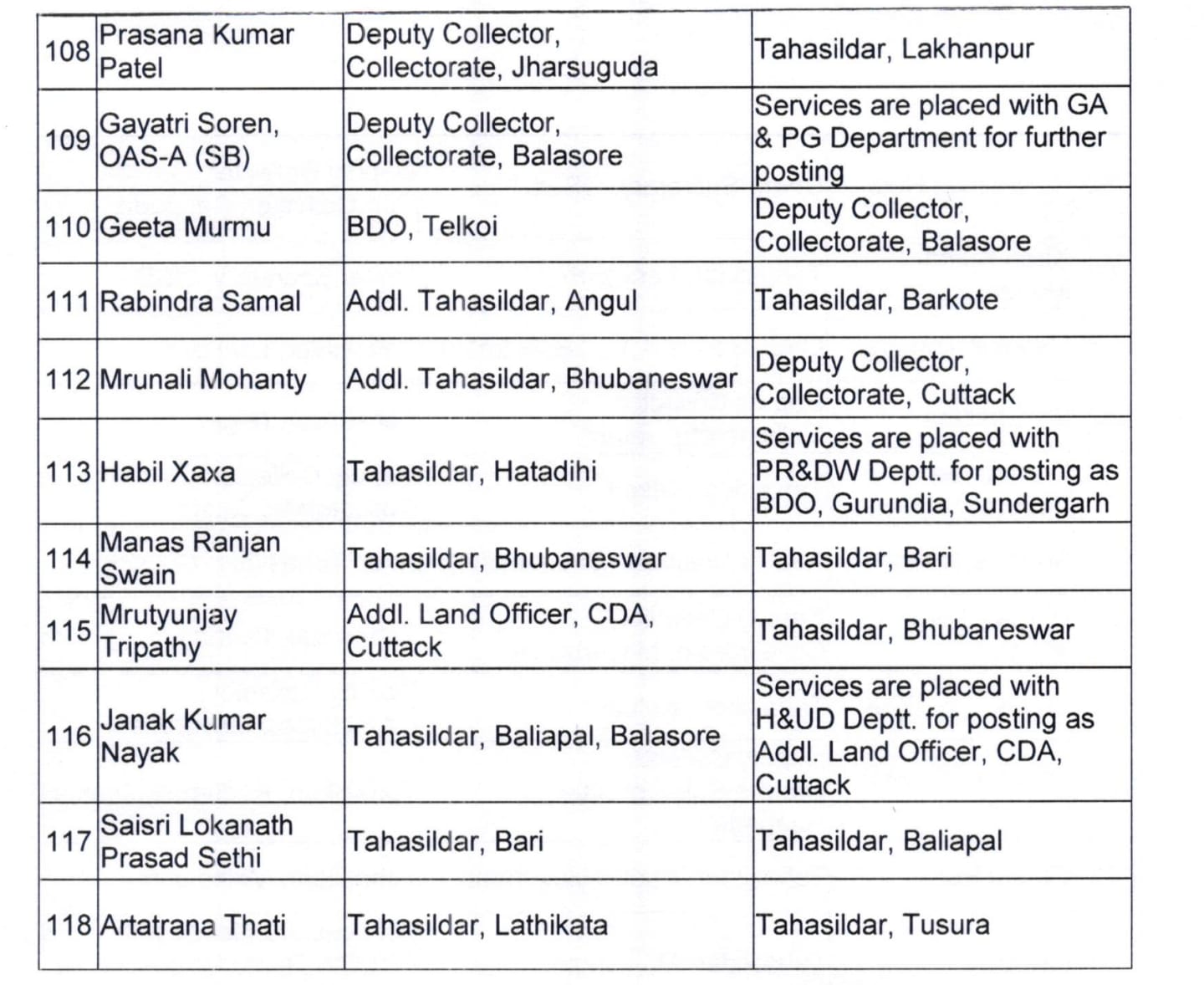 Bhubaneswar: In a a major reshuffle in the OAS cadre, the Odisha government has assigned new postings to 118 officers. Here's the list issued by the Revenue and Disaster Management department regarding transfer of the officers: