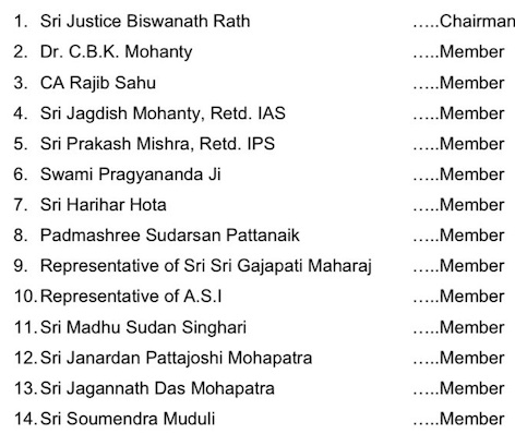 A new committee has instead been reconstituted under the chairmanship of former judge of Orissa High Court, Justice Biswanath Rath. It comprises of 15 other members, including representatives of ASI and Gajapati Maharaj and Puri Collector, with chief administrator of Shree Jagannath Temple Administration (SJTA) as the convenor.