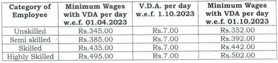 Accordingly, the present rate of minimum wages including VDA per day with effect from 1st October 2023 is as under: