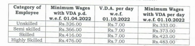 With the hike in the VDA, the minimum wage for unskilled workers will be Rs 333/day while it will be Rs 373 for semi-skilled workers, Rs 423 for skilled workers, and Rs 483 for highly skilled workers.