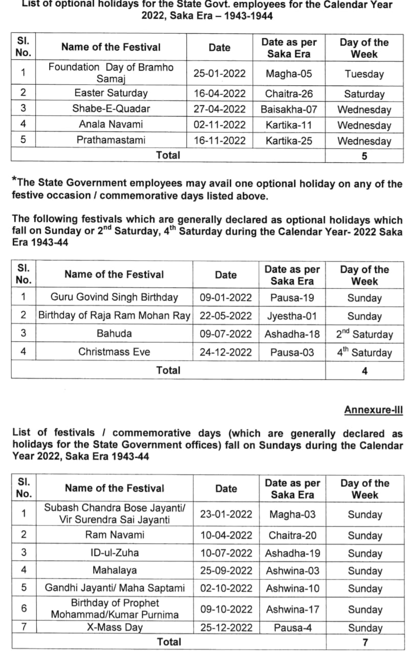 The birthday of Pandit Raghunath Murmu, which used to be an optional holiday since 2017, has been declared as a holiday for 2022. Baisakha Purnima and Budhha Jayanti fall on the same day.