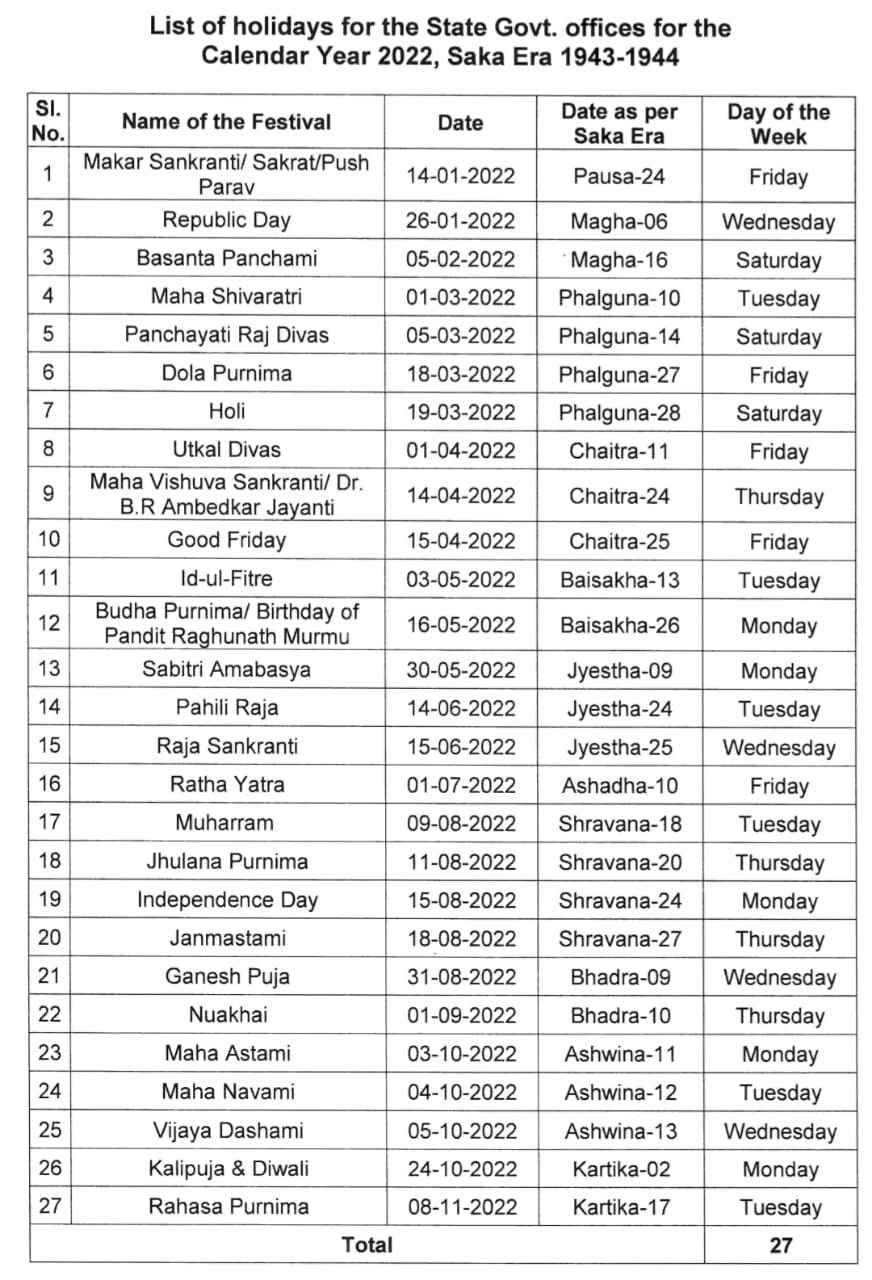 Bhubaneswar: A total of 27 holidays have been listed by the Odisha government for the 2022 calendar year for its offices, Revenue and Magisterial courts, banks and other banking institutions.