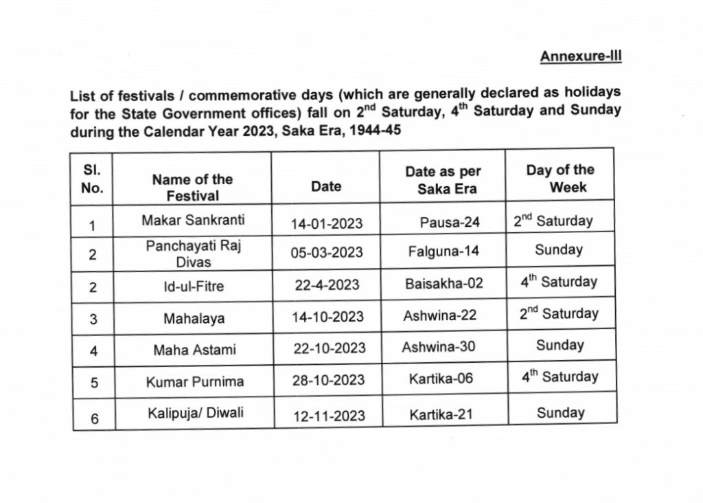 Bhubaneswar: A total of 27 holidays have been listed by the Odisha government for its offices, Revenue and Magisterial courts, banks, and other banking institutions for the 2023 calendar year.