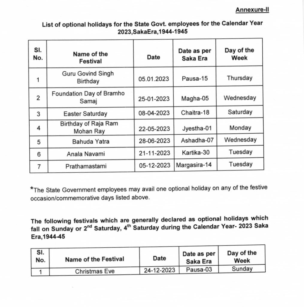 Bhubaneswar: A total of 27 holidays have been listed by the Odisha government for its offices, Revenue and Magisterial courts, banks, and other banking institutions for the 2023 calendar year.