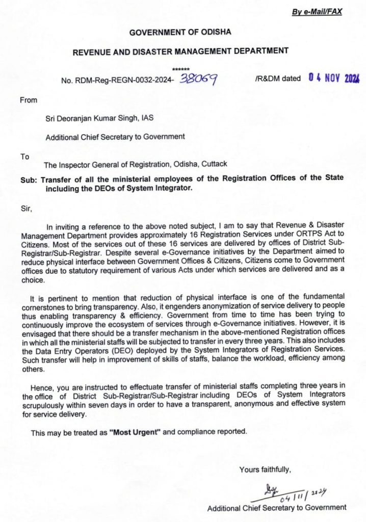Additional Chief Secretary of the department D K Singh has issued a communication to the Inspector General of Registration (IGR) instructing him to effectuate transfer of ministerial staff completing three years in the office of district sub-registrar/sub-registrar including DEOs of system integrators within seven days.