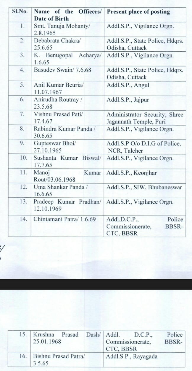The promoted officers are: Tanuja Mohanty, Debabrata Chakra, K. Benugopal Acharya, Basudev Swain, Anil Kumar Beuria, Anirudha Routray, Vishnu Prasad Pati, Rabindra Kumar Panda, Gupteswar Bhoi, Sushanta Kumar Biswal, Manoj Kumar Rout, Uma Shankar Panda, Pradeep Kumar Pradhan, Chintamani Patra, Krushna Prasad Dash and Bishnu Prasad Patra.