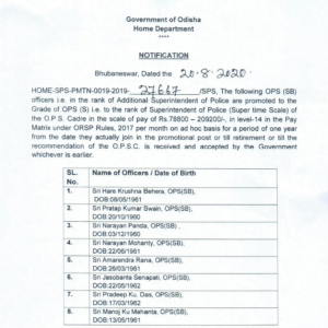 Bhubaneswar: The state government on Thursday promoted 8 Additional Superintendent of Police officers to the rank of Superintendent of Police (SP).