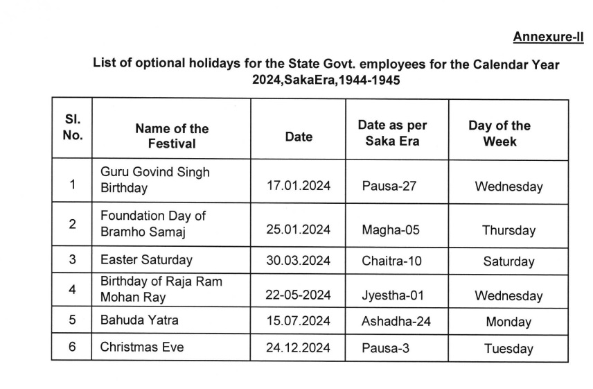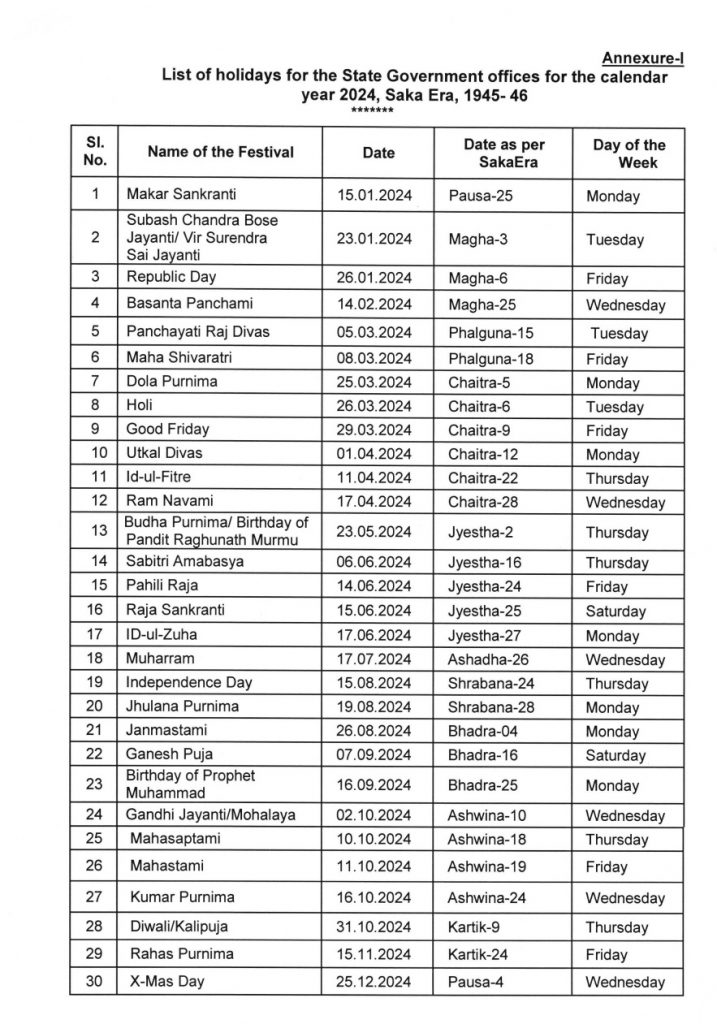 Bhubaneswar: Odisha government has released the lists of holidays and optional holidays for its employees in the calendar year 2024.