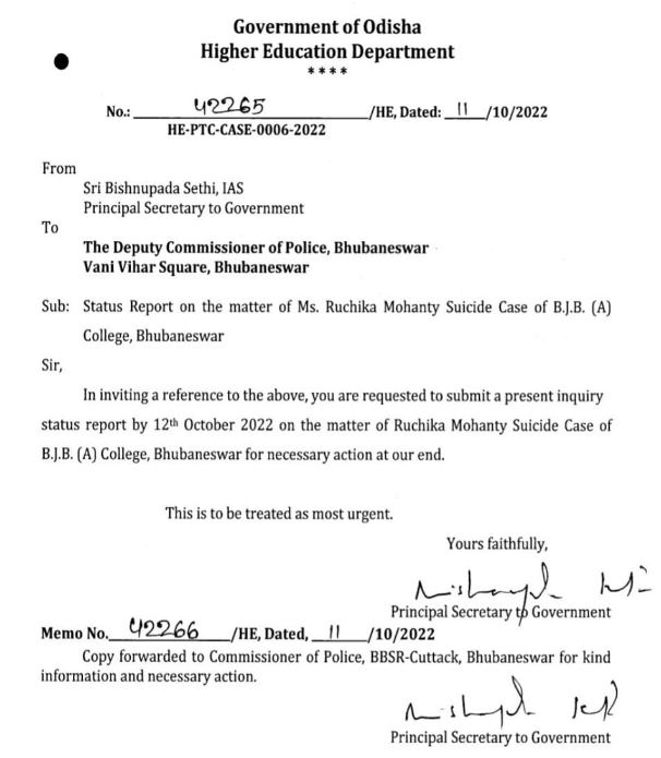 In a communication to the Bhubaneswar Deputy Commissioner of Police, Principal Secretary, Higher Education, Bishnupada Sethi requested him to submit a present inquiry status report by October 12 in the matter relating to Ruchika Mohanty suicide case for necessary action.