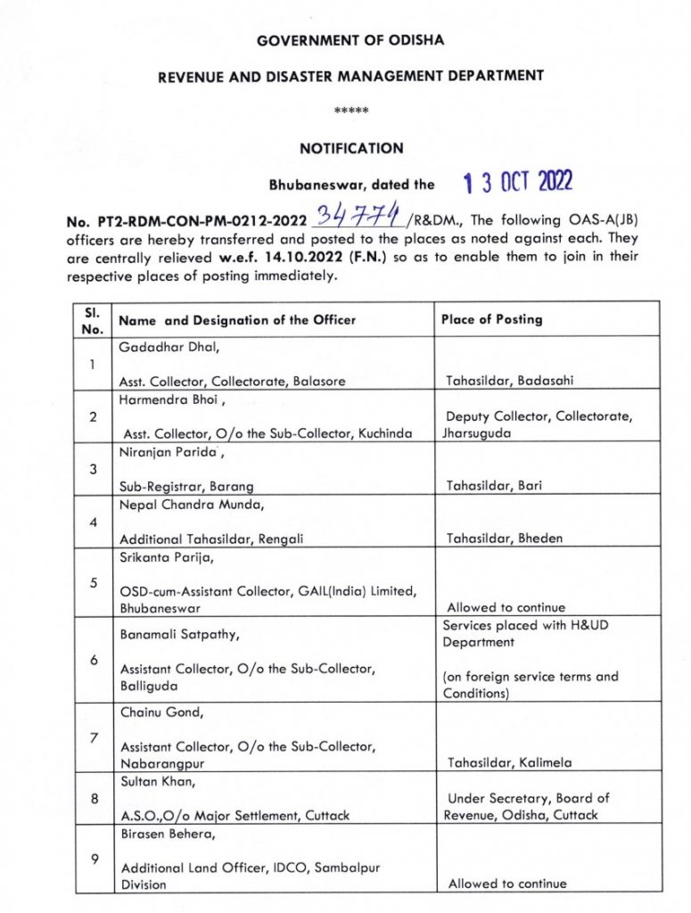 According to an official notification of the Revenue and Disaster Management department, as many as 139 OAS officers have been transferred from their present posts in the state.