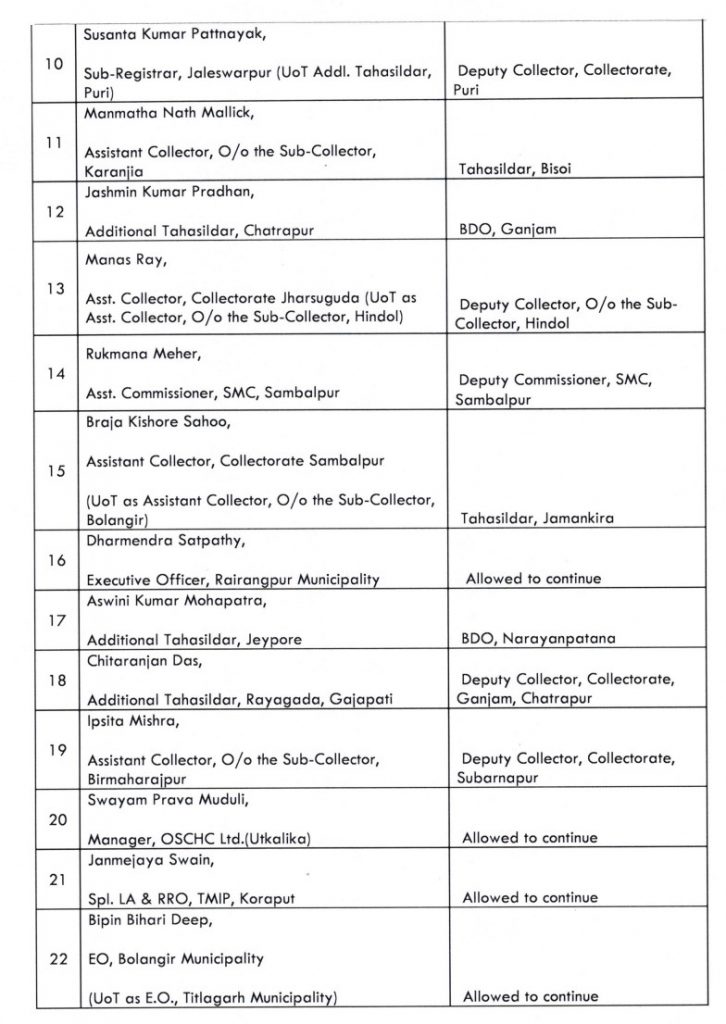 Bhubaneswar: Susant Kumar Pattanayak, sub-registrar (UoT additional tehsildar, Puri) has been posted as deputy collector, Puri in a major reshuffle of OAS officers effected by Odisha government on Thursday.