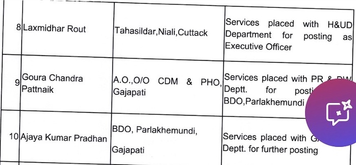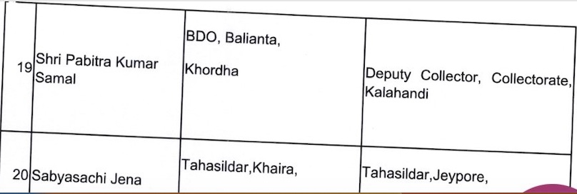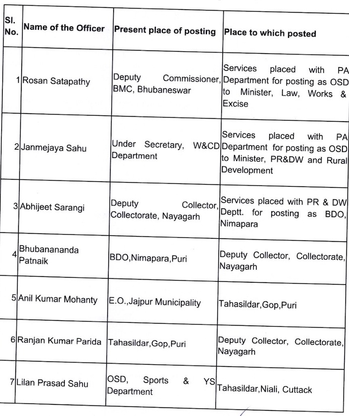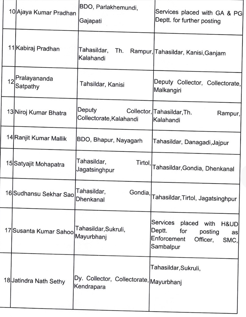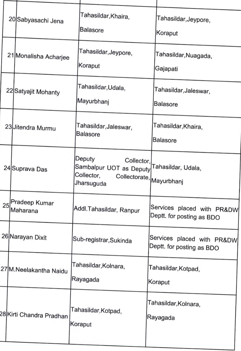 Bhubaneswar: The Odisha government has effected a bureaucratic reshuffle the OAS cadre and transferred 29 officers, including several tehsildars.