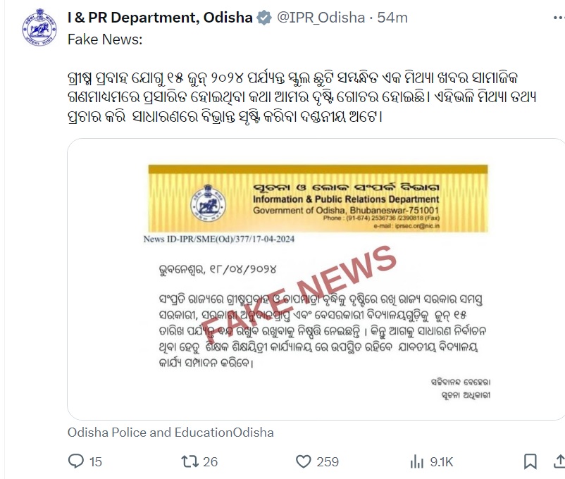The Information and Public Relations department, in a post in X (formerly Twitter), said that a purported government notification on closure of all government, aided and private schools due to heatwave till June 15, has been doing the rounds on social media.