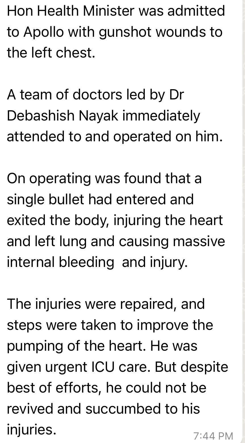After initial treatment at the district headquarters hospital in Jharsuguda, Naba Das was airlifted and shifted to Apollo Hospitals, Bhubaneswar. His condition was stated to be very critical. A team of specialists drawn from Apollo Hospital, SCB Medical College and Hospital and Capital Hospital were called in for his treatment.
